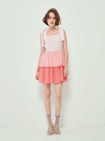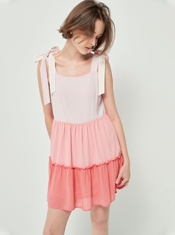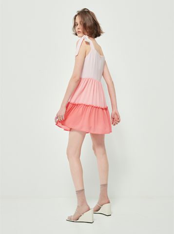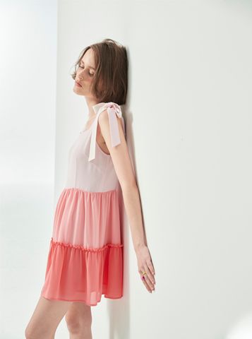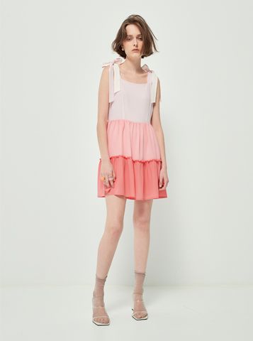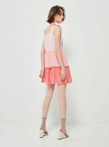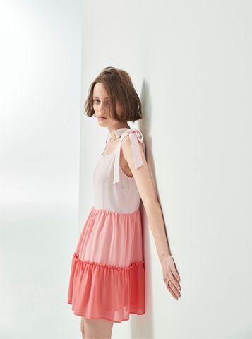 Váy liền có thiết kế các tầng màu từ đậm dến nhạt, váy 2 dây, có 2 đoạn dây trên vai để cột nơ.