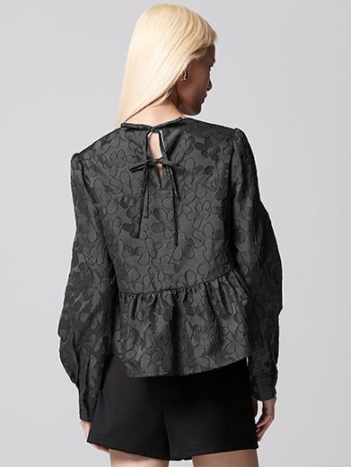 Thiết kế tay phồng nhẹ nhàng, chi tiết nhún bèo ở eo và điểm nhấn nơ buộc tinh tế phía sau tạo nên vẻ ngoài ngọt ngào và lãng mạn. Họa tiết hoa lá dập nổi độc đáo trên nền vải càng tăng thêm sự sang trọng, thu hút cho mọi cô nàng.