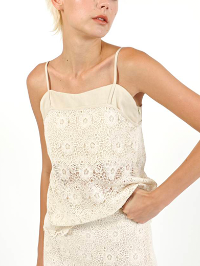 Áo hai dây dáng ngắn, chất liệu ren hoa tinh xảo mang lại vẻ mềm mại và nữ tính. Thiết kế ôm nhẹ phần thân, viền scallop uyển chuyển giúp tổng thể trông thanh thoát và tinh tế.