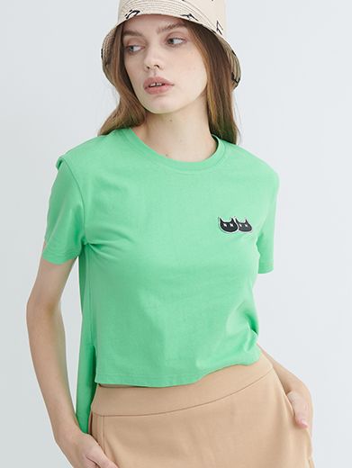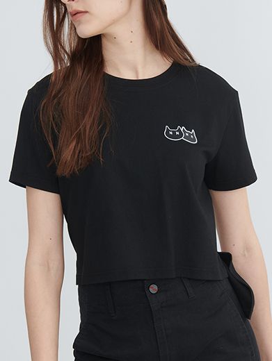Áo thun crop in họa tiết mèo con, vạt sau dài.