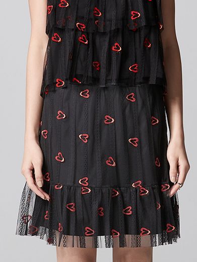 Thiết kế dạng tầng bồng bềnh và nhún bèo điệu đà, kết hợp hoàn hảo với họa tiết trái tim được in xuyên suốt trên nền vải voan/lưới. Đây là item hoàn hảo để phối cùng áo hai dây cùng set hoặc crop top, mang lại vẻ ngoài nữ tính và thời thượng.