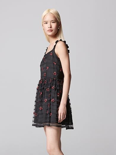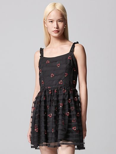 Thiết kế hai dây với chi tiết nhún bèo điệu đà ở vai, kết hợp cùng chân váy xòe bồng bềnh và lớp voan/lưới thêu họa tiết trái tim tinh tế. Đây là lựa chọn hoàn hảo để tôn lên vẻ nữ tính và cá tính của bạn.