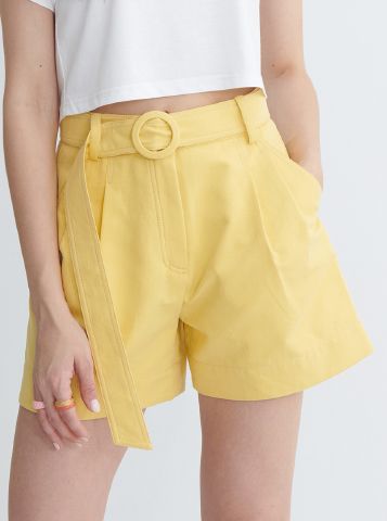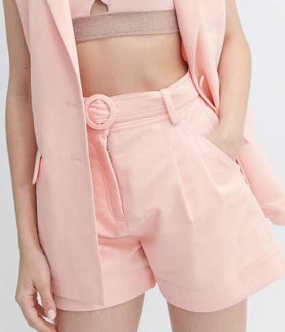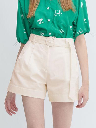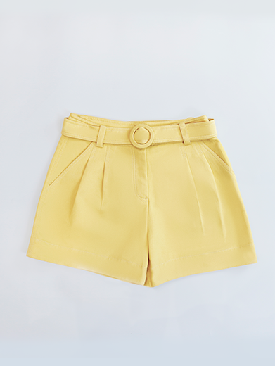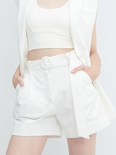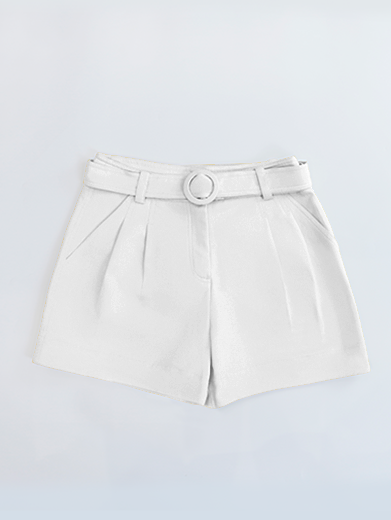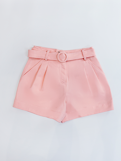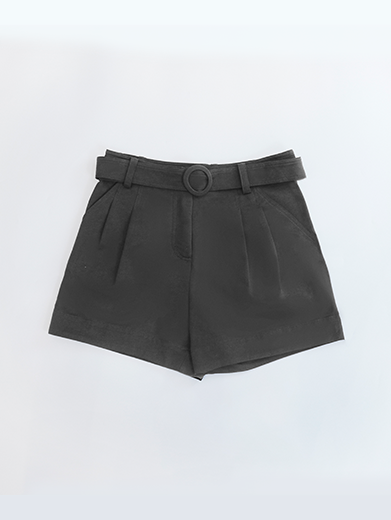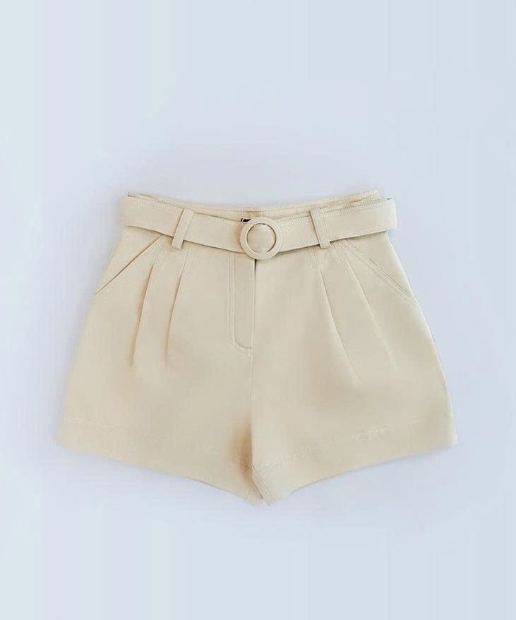 Quần short lưng cao (high-waisted shorts), có thiết kế dây đai cùng màu với khoá cài dạng khuy tròn, tạo cảm giác thanh lịch nhưng vẫn trẻ trung, phù hợp đi chơi hay phối theo phong cách smart-casual.