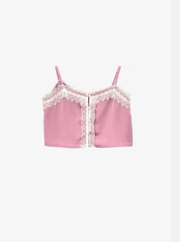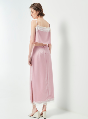 Set váy lụa lưng viền ren tạo điểm nhấn.