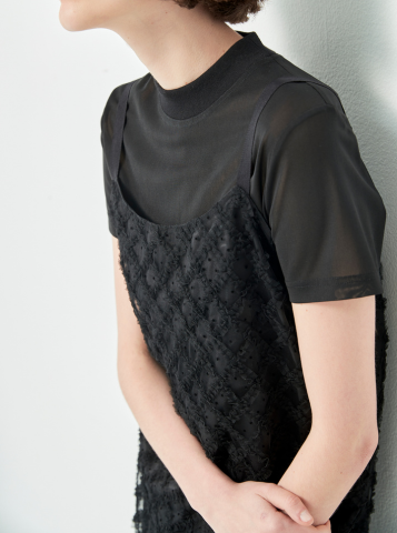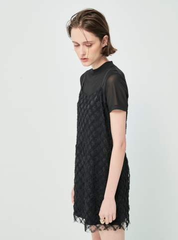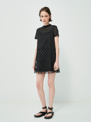 Chiếc váy trong hình là hiện thân của sự tinh tế và cá tính hiện đại. Với thiết kế layer ren đen tạo nên một tổng thể thời thượng, vừa phóng khoáng lại vừa thanh lịch. Họa tiết caro dập nổi trên nền ren mang đến cảm giác sang trọng và quyến rũ một cách nhẹ nhàng, chi tiết cổ cao nhẹ và tay ngắn tạo điểm nhấn tinh tế, phù hợp cho những cô nàng yêu thích sự tối giản nhưng vẫn muốn khẳng định cá tính riêng. Độ dài váy vừa phải giúp tôn dáng, khoe khéo đôi chân thon dài, đồng thời tạo cảm giác năng động, trẻ trung. Phối cùng sandals đế bệt, tổng thể trang phục mang đậm phong cách Urban chic – phóng khoáng, hiện đại và đầy thu hút.